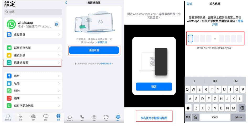🟢iPhone【操作提示】:開啟WhatsApp--點選【設定】--【已關聯的裝置】--【連結新裝置】--【改用電話號碼關聯】--輸入【安全碼】 🟢Android【操作提示】:開啟WhatsApp--點選右上角【⋮】--選擇【已關聯裝置】--點選【關聯新裝置】--【改用電話號碼關聯】--輸入【安全碼】